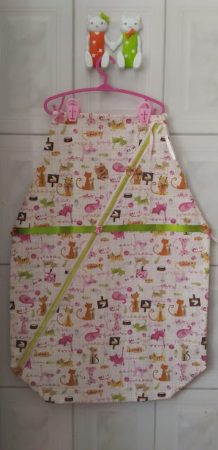 Estampa Gatinhos Delicados: tecido com vários gatinhos em cores suaves e lacinhos no pescoço. Lindo adereço de gatinho rosa colado no centro sobre a faixa verde. Verso plastificado nos mesmos tons da estampa em tecido, decorado com lacinhos.